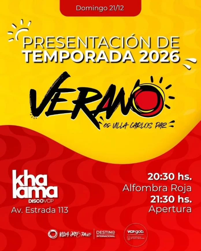 Villa Carlos Paz presentará oficialmente la Temporada de Verano 2025/26 el próximo domingo 21 de diciembre, en un evento que se realizará desde las 21.30 en la disco Khalama, ubicada en avenida Estrada 113. La noche incluirá el tradicional desfile por la alfombra roja, donde artistas y elencos teatrales difundirán sus propuestas para la temporada estival.