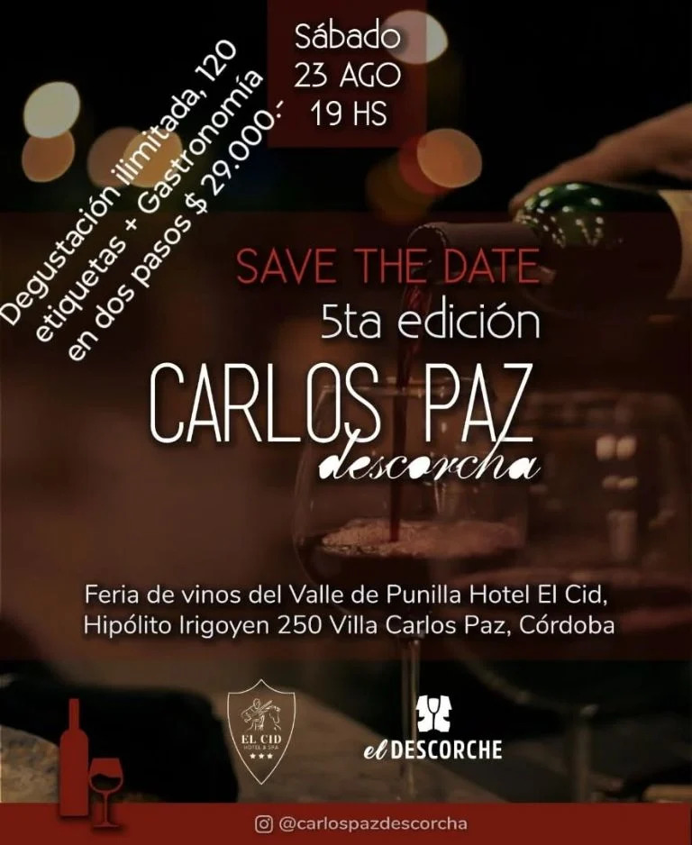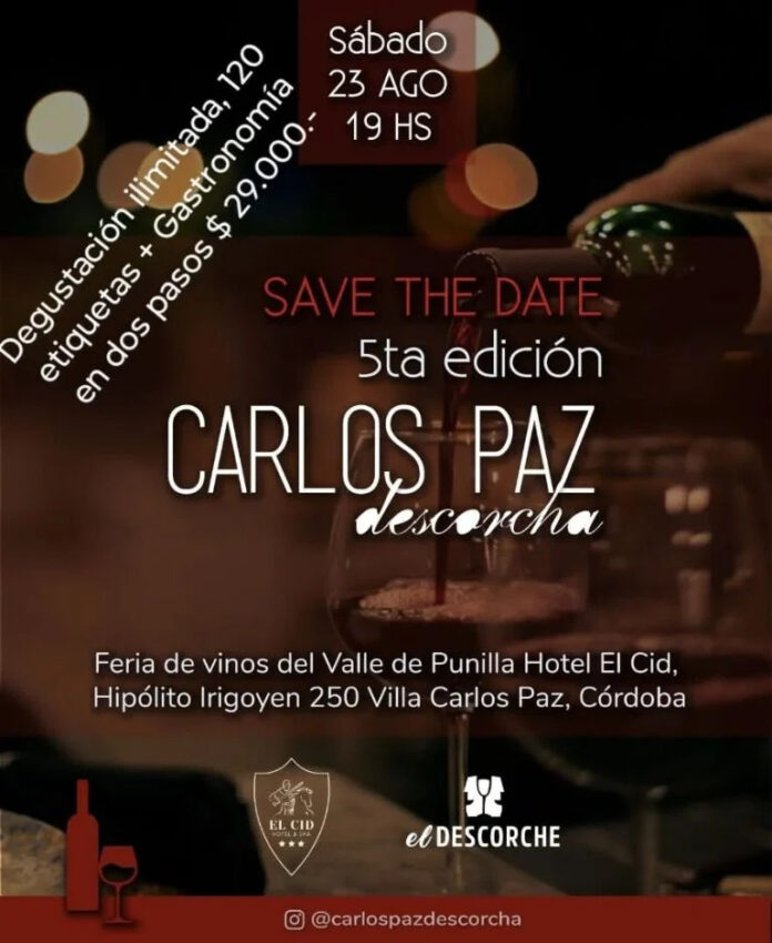 Este sábado 23 de agosto a las 19 horas, Villa Carlos Paz será sede de la 5ª edición de Carlos Paz Descorcha, la feria de vinos que reúne a bodegas y productores del Valle de Punilla y de distintas regiones del país.