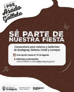 Palpitando lo que será la gran Fiesta del Asado y la Galleta, los días 21, 22 y 23 de noviembre, la Secretaría de Turismo, Cultura y Deportes invita a sumarse a la convocatoria del evento «Pre Asado y la Galleta», que se realizará el 22 de agosto a las 14:00 hs, en el Auditorio Municipal.