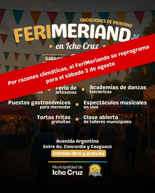Debido al pronóstico climático adverso previsto para este fin de semana, la Municipalidad de Icho Cruz informó que la nueva edición del FeriMeriando se reprograma para el sábado 2 de agosto, desde las 14:00 hs, en Avenida Argentina, entre Av. Concordia y Caaguazú.