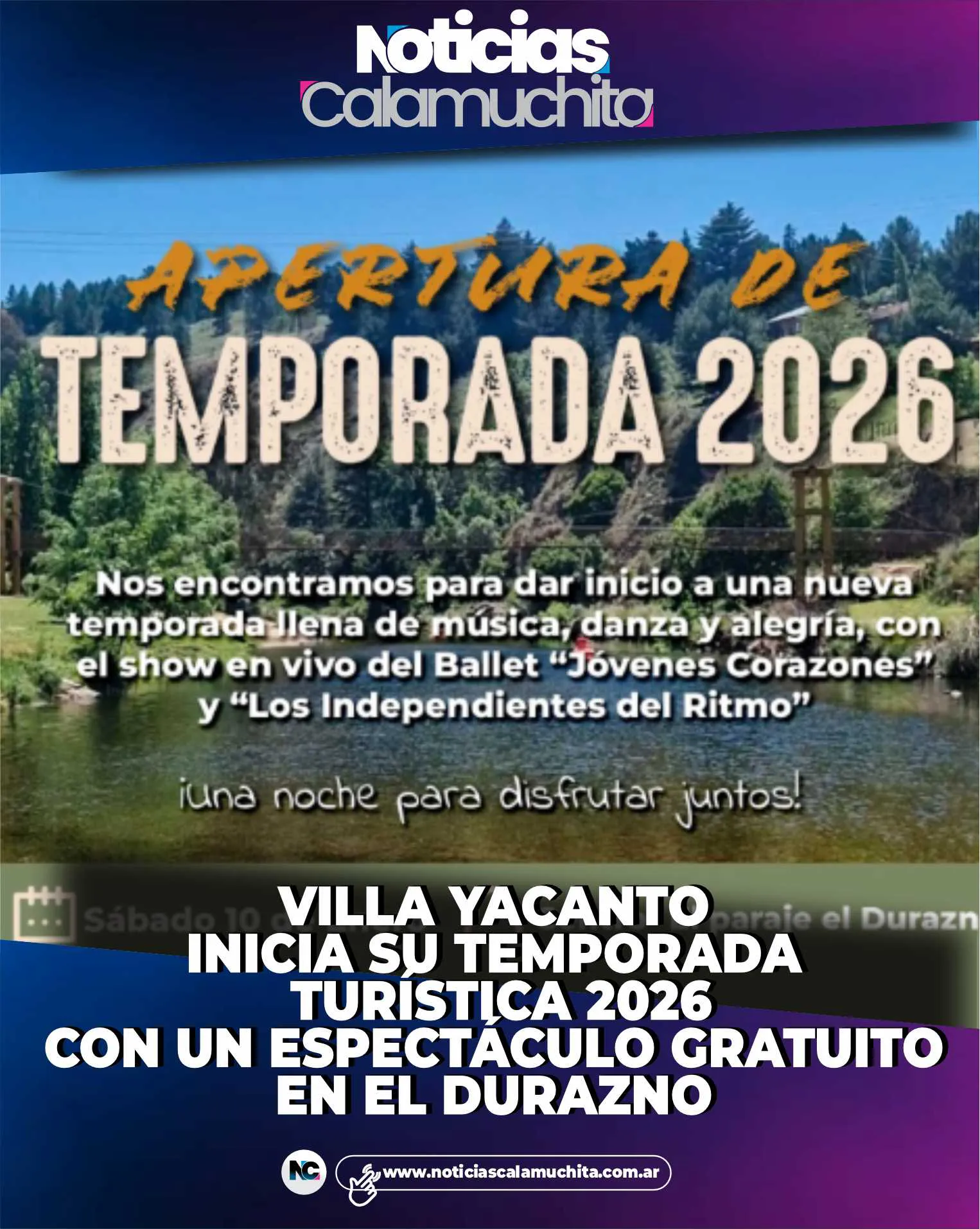 Villa Yacanto dará inicio oficial a su temporada turística de verano 2026 este sábado 10 de enero con un evento artístico gratuito en el paraje El Durazno. La apertura contará con las presentaciones del Ballet “Jóvenes Corazones” y el grupo “Los Independientes del Ritmo”, ofreciendo una noche de música y danza para toda la comunidad y visitantes.